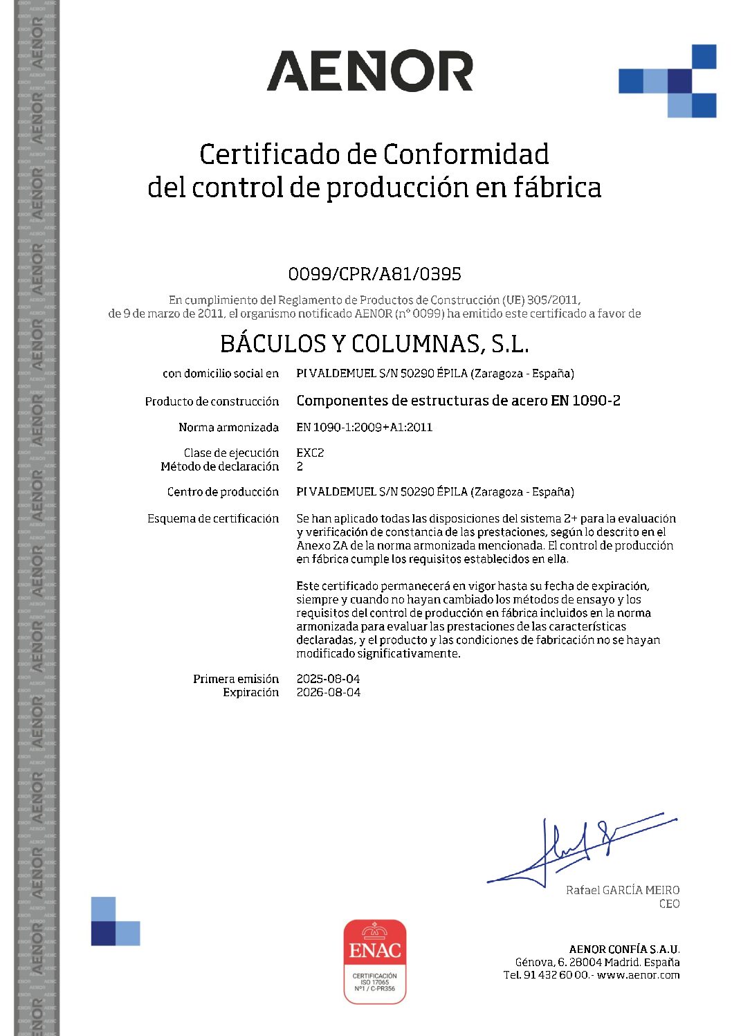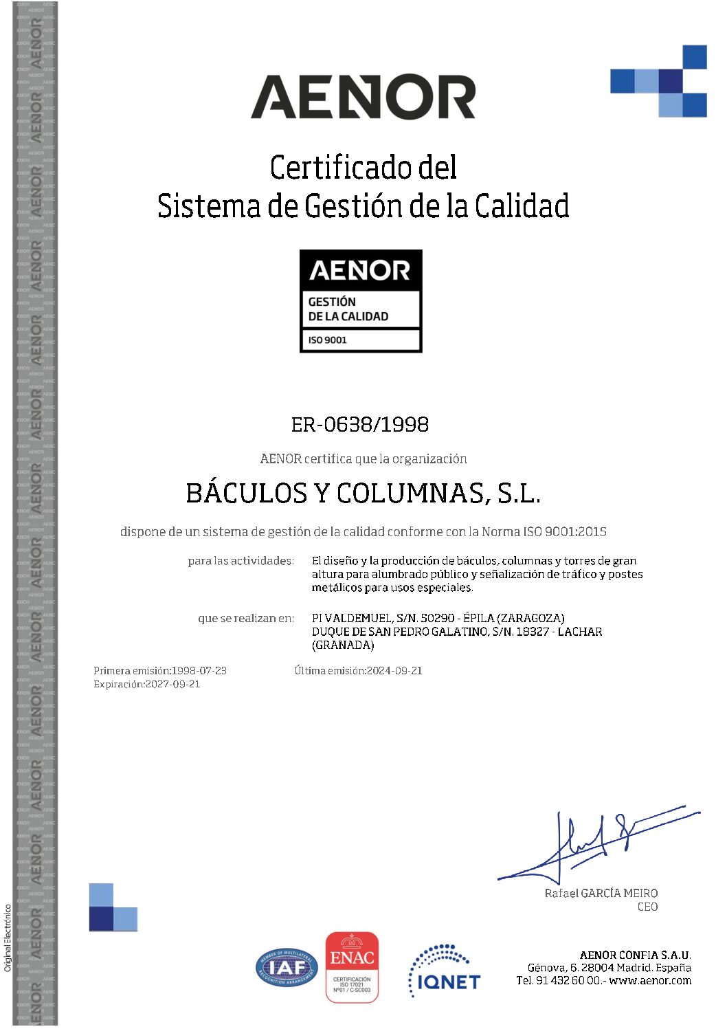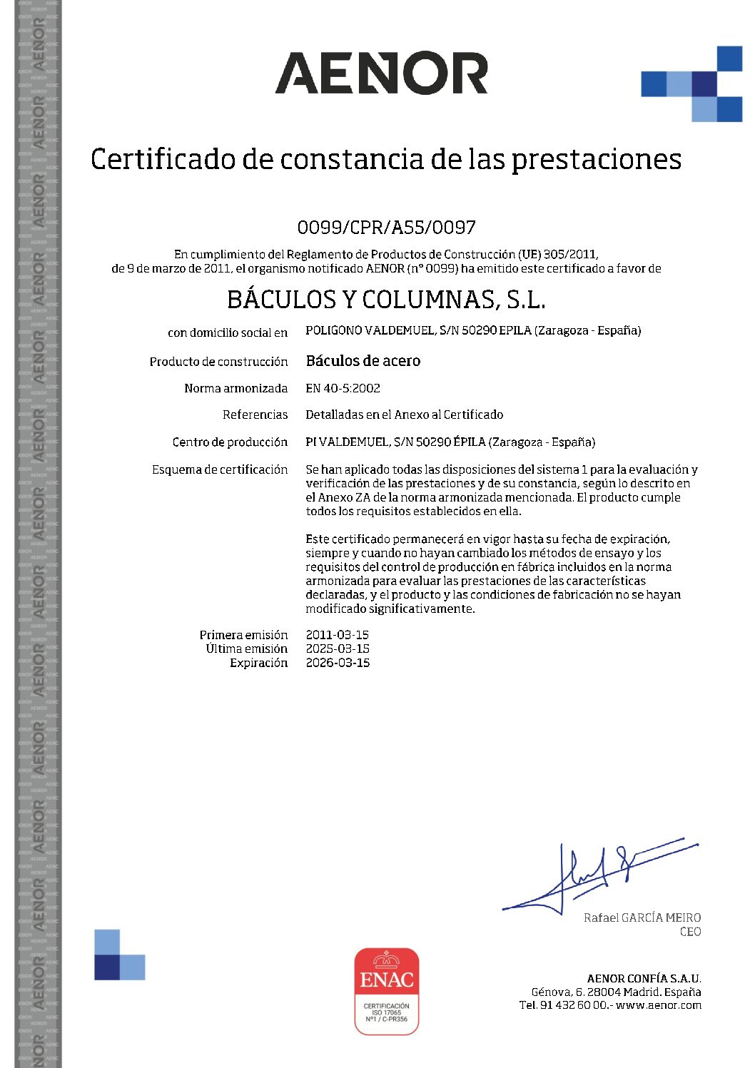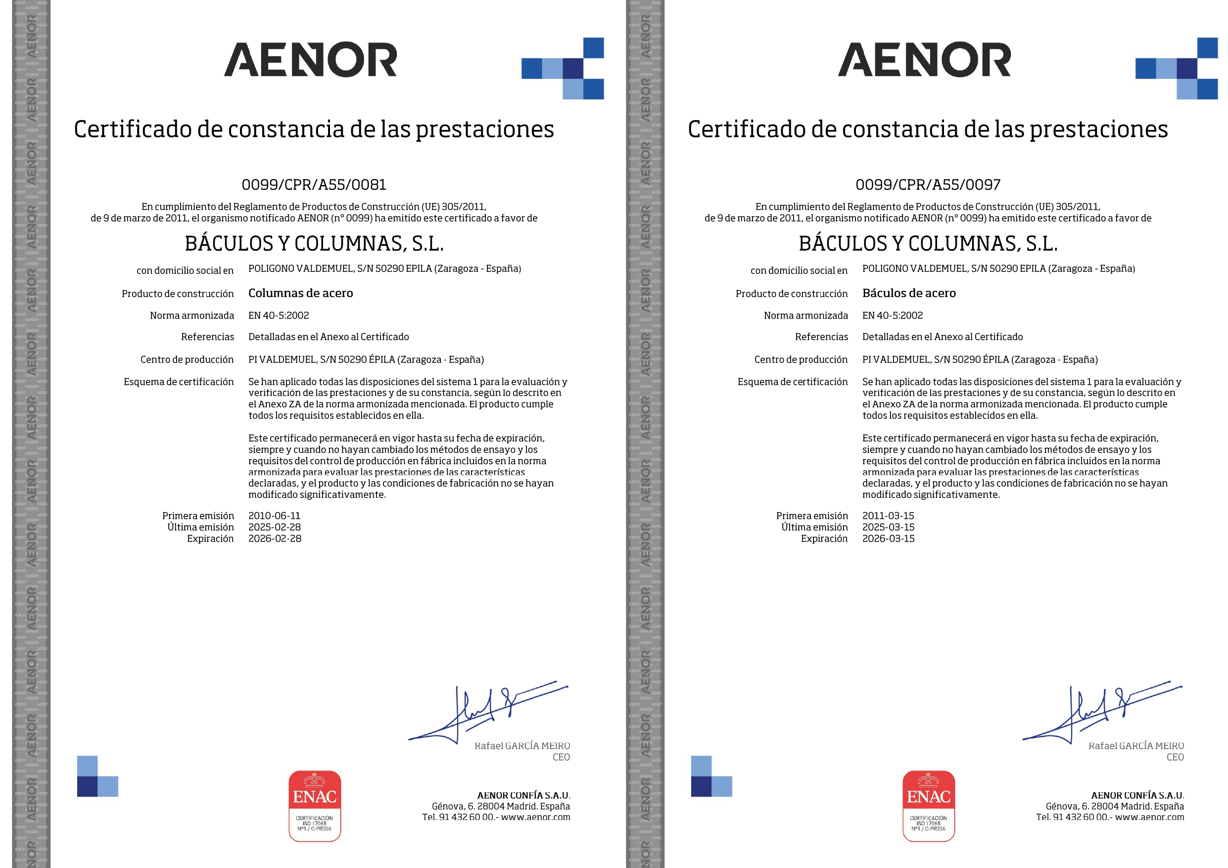 BACULOS Y COLUMNAS S.L. está en posesión del Registro de empresa AENOR según ISO 9001:2001 y sus productos tienen marca CE y marca N de AENOR según EN 40-5.