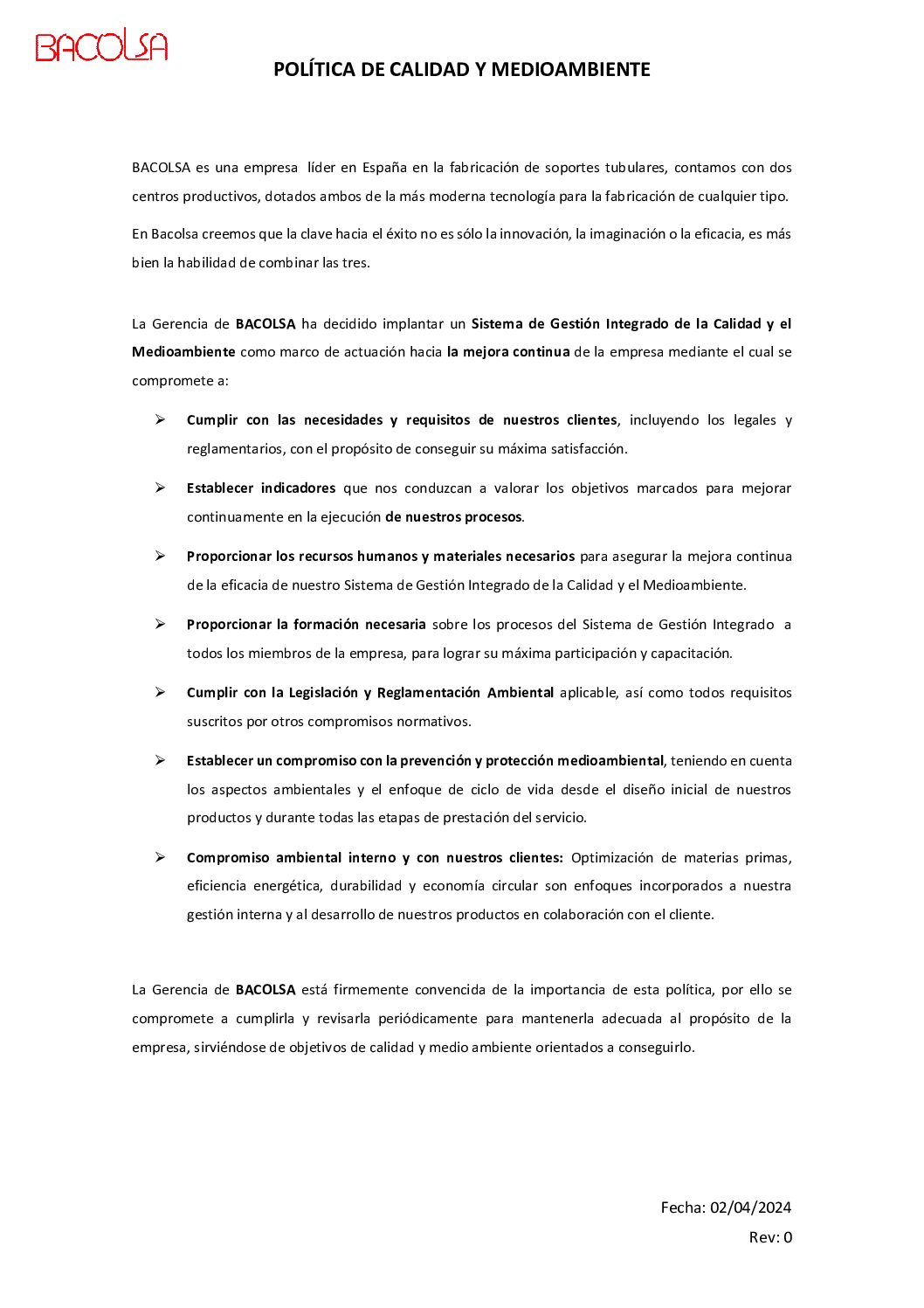 Bacolsa ha adquirido un compromiso con la Calidad y el Medioambiente en los que todos sus procesos están encaminados a ofrecer productos con las máximas garantías. La Política de Calidad y Medioambiente de Bacolsa está diseñada para obtener la máxima competitividad en el sector, liderar la sostenibilidad de la Organización y fomentar la innovación y la transparencia de cara a las partes interesadas. Pera ello cuenta con un Sistema de Gestión Integrado que da respuestas a cada uno de los retos que nos hemos planteado.